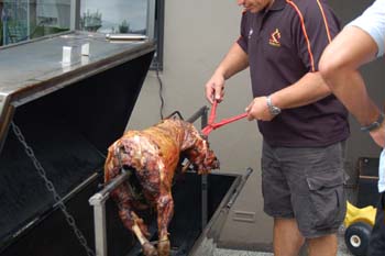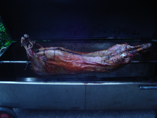 John thought it would take at least four hours for the lamb to cook. However as it turned out after a couple of hours they had to turn off the spit as the lamb appeared to be nearly cooked.