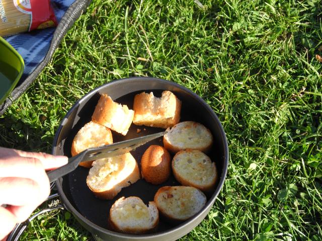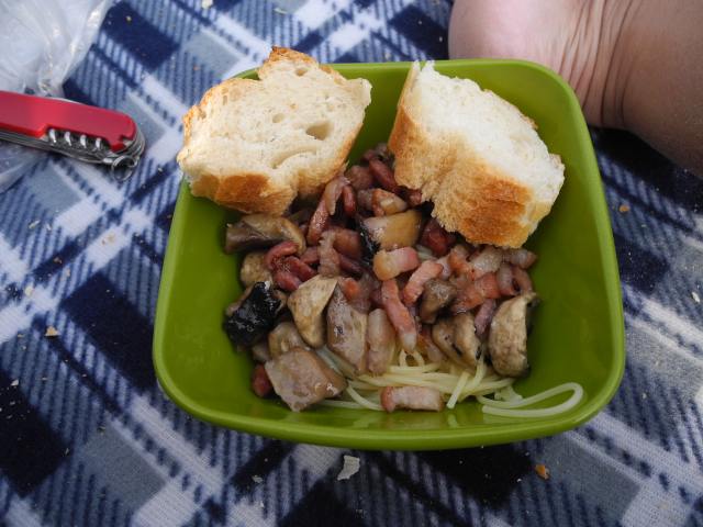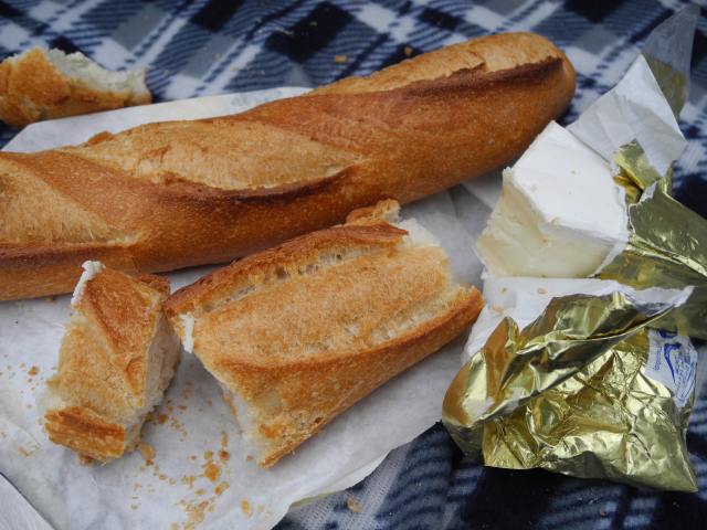 We had no fresh food and there were no shops around so we made do with what we had, which was half a stale baguette, leftover ham, tuna and rice.